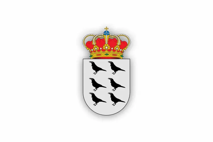 Escudo del concejo de Pravia. Sobre fondo plateado aparecen seis cuervos de sable pasantes a la derecha colocados en dos palos distribuidos de tres en tres. Está rematado por una corona real, que simboliza el periodo de capitalidad durante la &# ...
